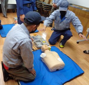 実際に119番通報を行う通報訓練・水消火器を使っての消火訓練・人形を使って心臓マッサージとAEDの使い方といった、応急救護訓練を実施しました。